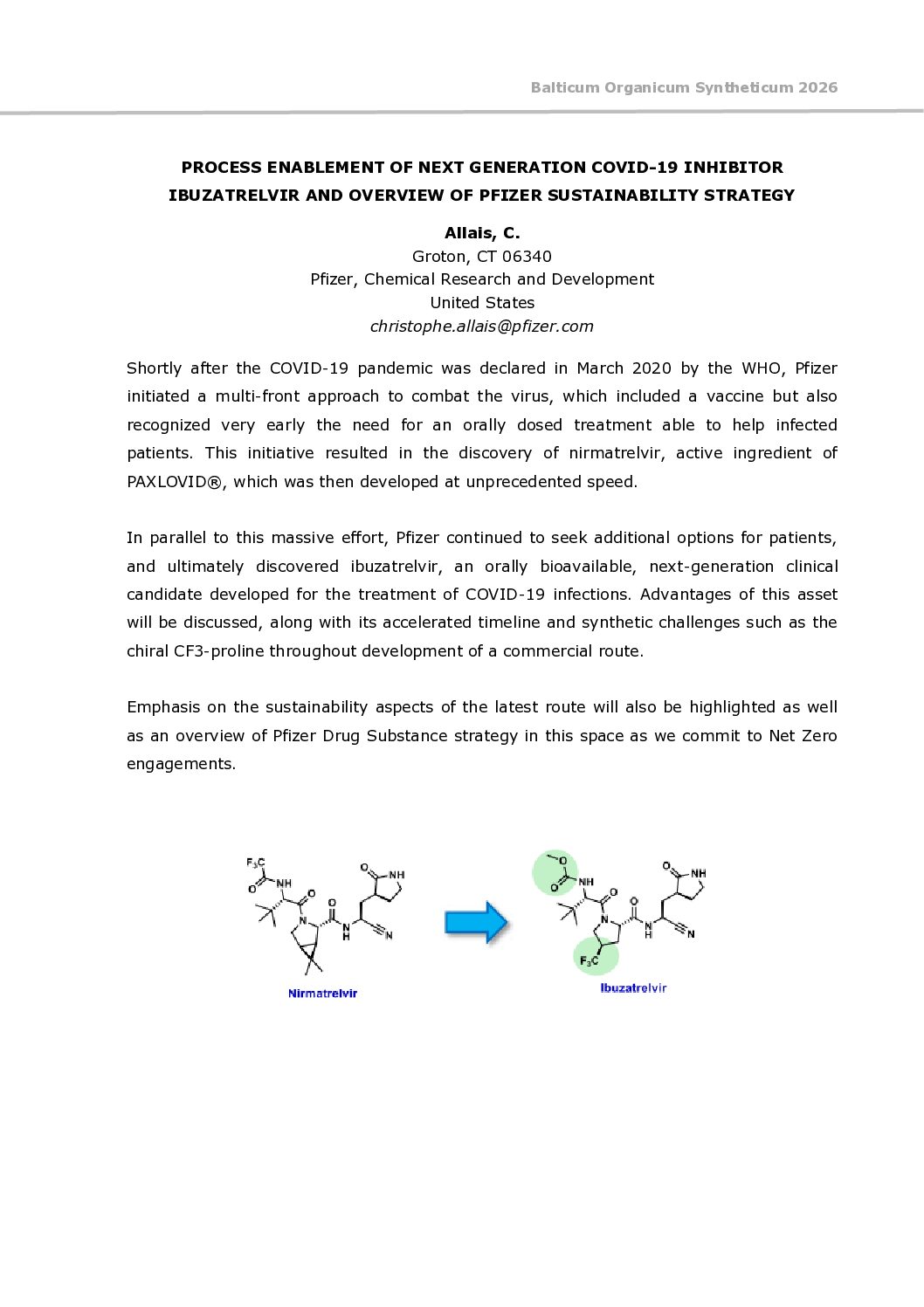 • PROCESS ENABLEMENT OF NEXT GENERATION COVID-19 INHIBITOR IBUZATRELVIR AND OVERVIEW OF PFIZER SUSTAINABILITY STRATEGY